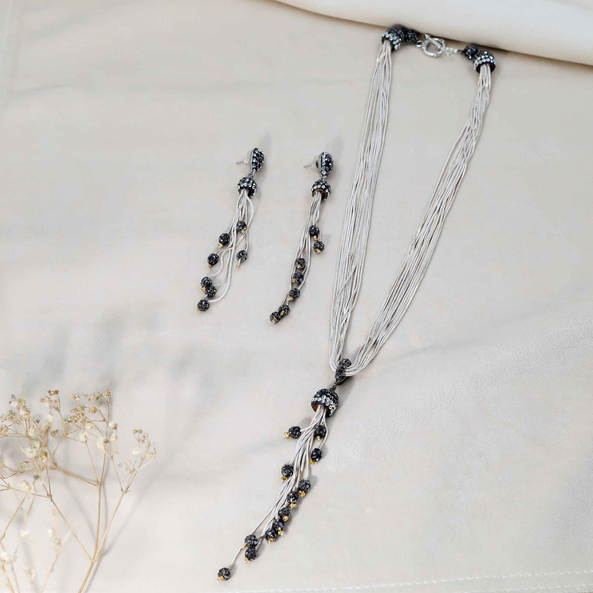 Elevate your style with this exquisite necklace and earring set. Featuring sleek silver-tone strands adorned with delicate, shimmering black stones, the cascading design adds elegance and charm—perfect for both casual and formal occasions.