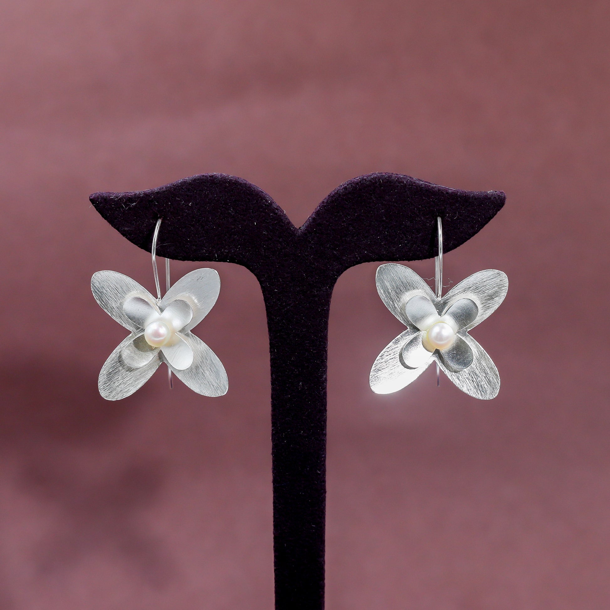 These elegant silver earrings feature a charming floral design, beautifully adorned with delicate pearls at the center. Perfect for adding a touch of sophistication to any ensemble.