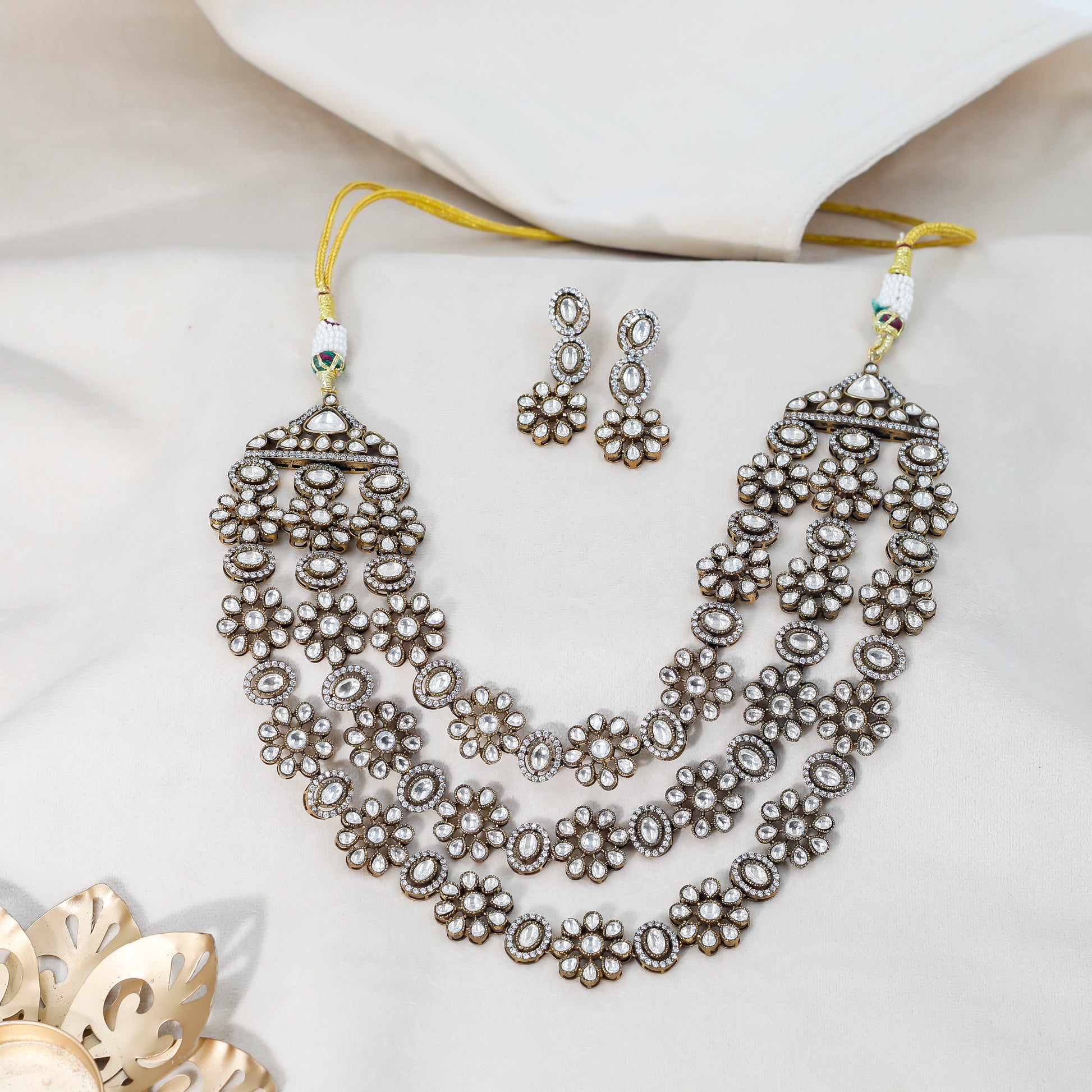 Radiate elegance with this dazzling layered floral necklace set! Crafted with intricate detailing and sparkling stones, it's the perfect blend of tradition and glamour for any special occasion.