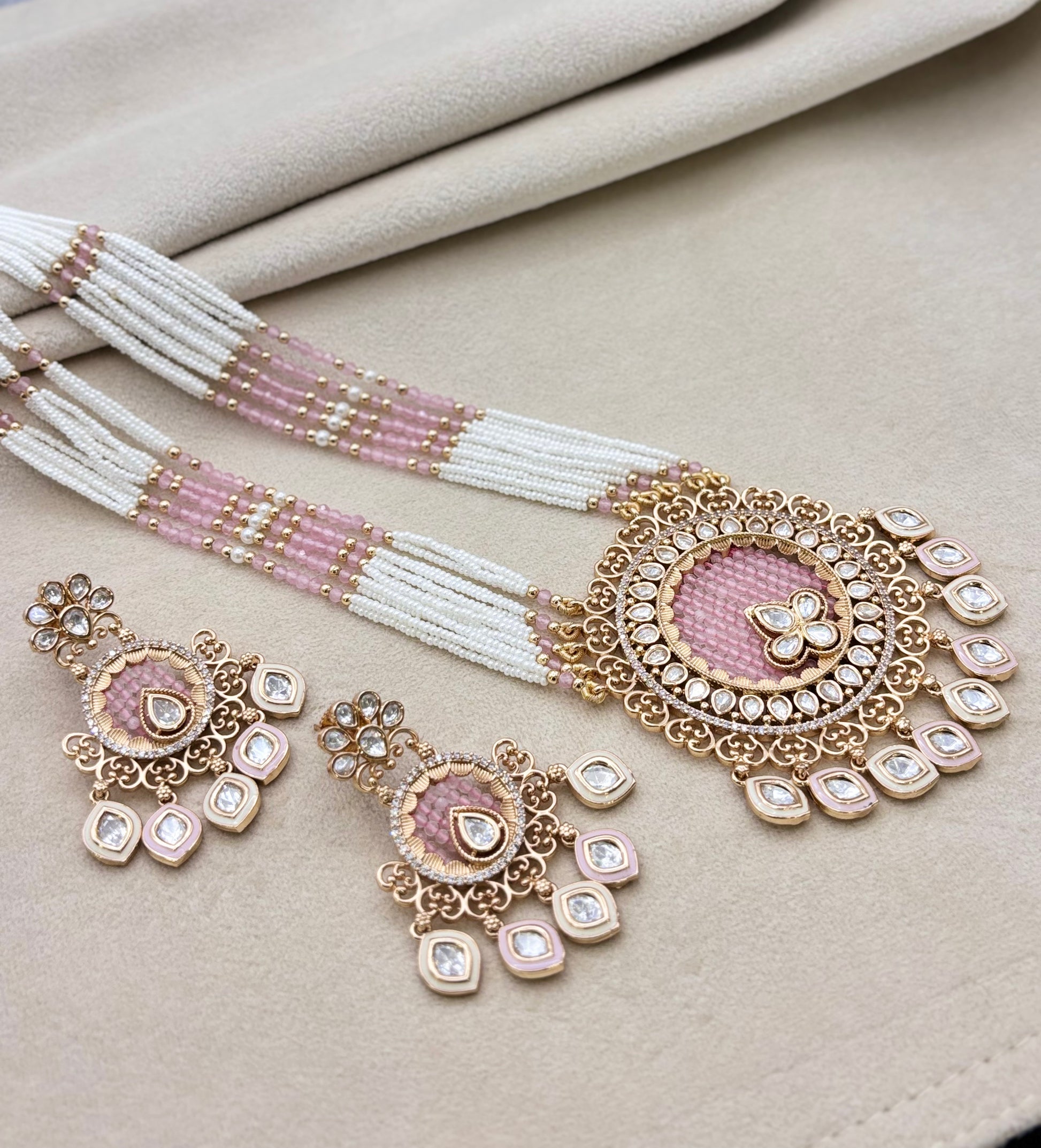 Revel in the splendor of heritage with this captivating Kundan Pearl Haar. This stunning piece features a magnificent central pendant adorned with intricate Kundan work, symbolizing timeless beauty. Delicate strands of pearls and soft lavender beads cascade gracefully, enhancing the aura of sophistication and charm. Accompanied by intricately designed earrings, this necklace is perfect for a bride or anyone looking to make a grand statement. Blending tradition with luxury, this Kundan Haar is a tribute to India's regal heritage, crafted to elevate your elegance on any special occasion.