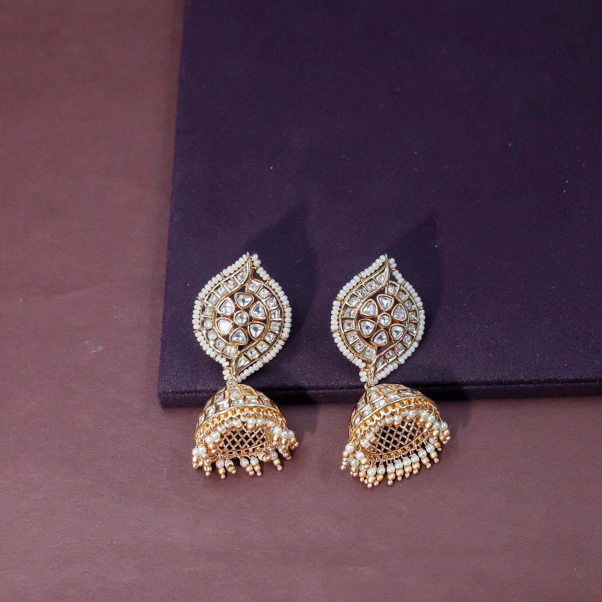 Adorned with intricate detailing and stunning polki stones, these earrings bring a regal charm. Ideal for festive gatherings or special occasions, they offer timeless elegance and unmatched sophistication to your ensemble.