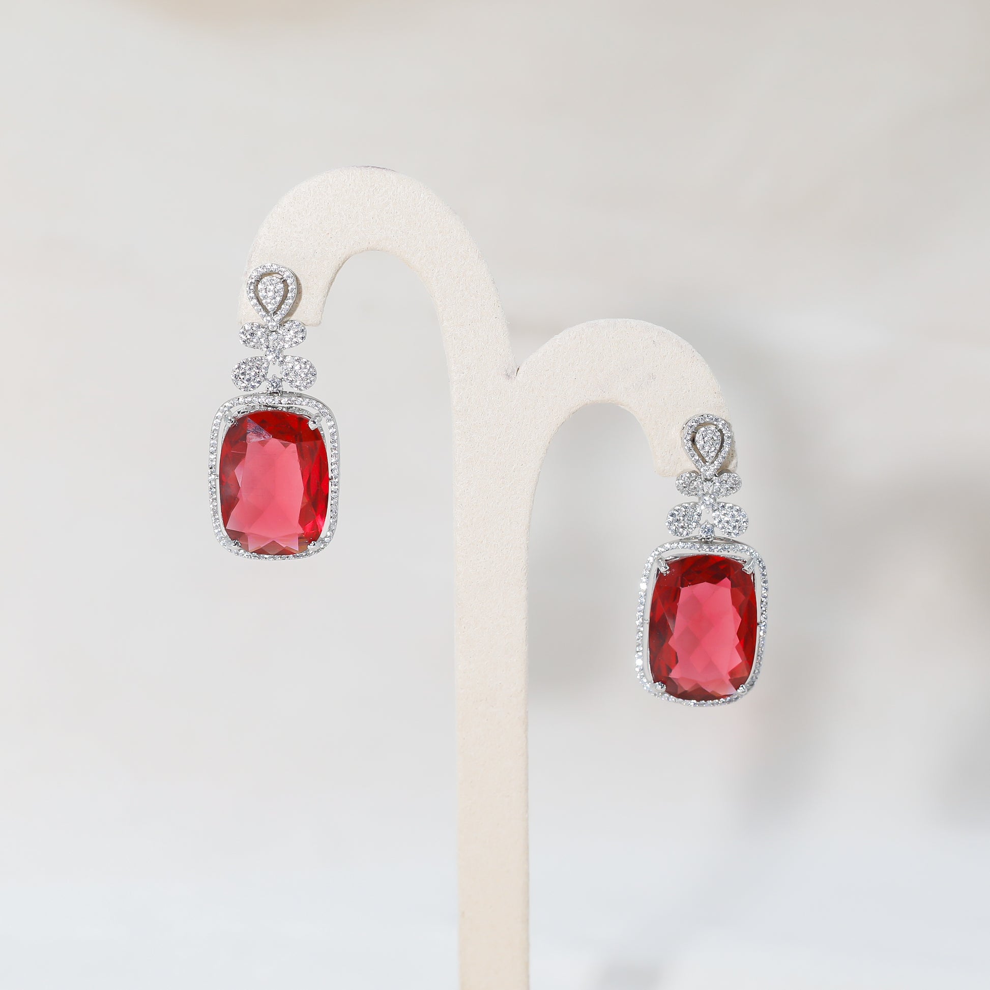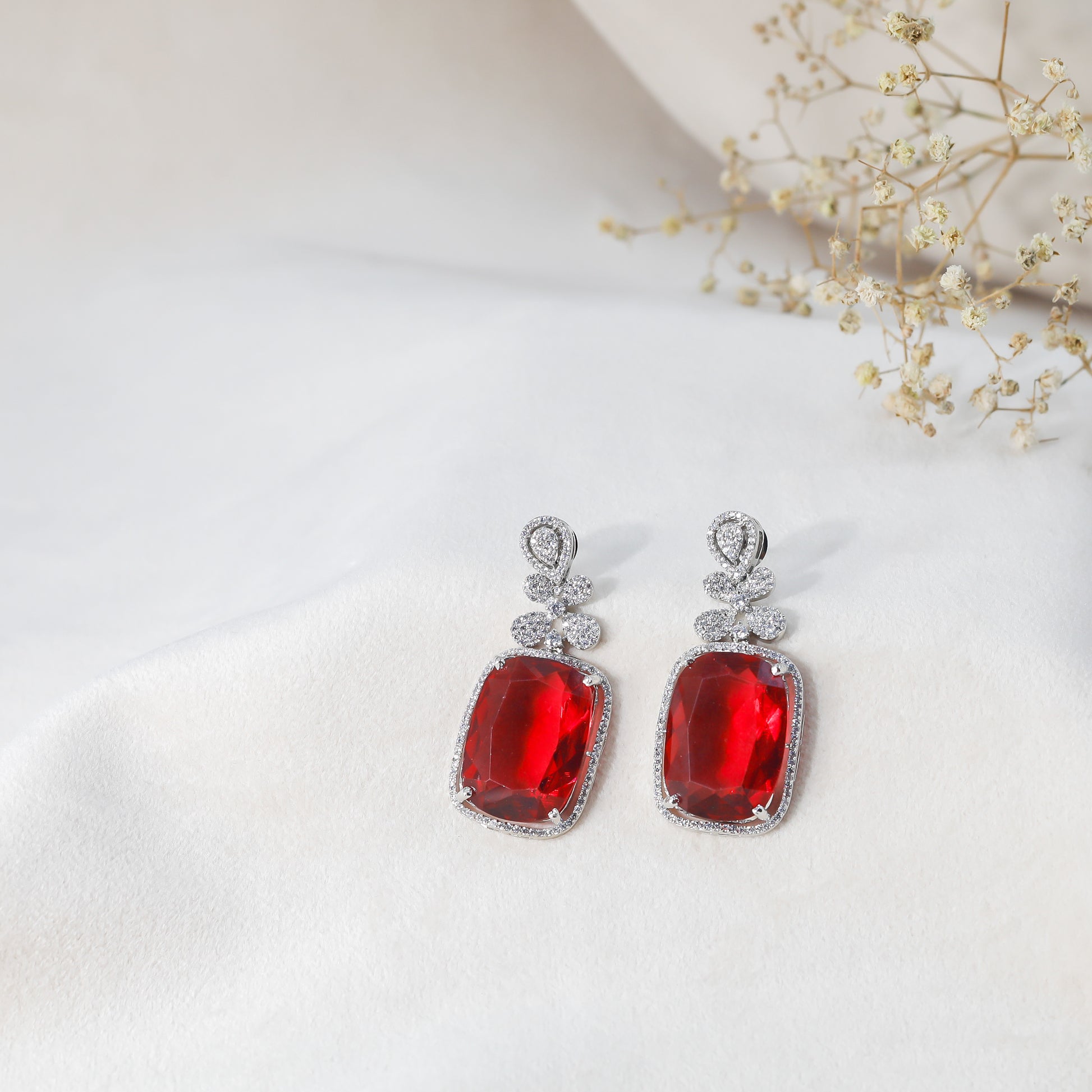 Elevate your elegance with these stunning red zirconia drop earrings. Featuring radiant, cushion-cut red stones surrounded by sparkling zirconia accents, these earrings are a statement of bold sophistication. The intricate floral design at the top adds a delicate touch, making them perfect for evening wear or special occasions.
