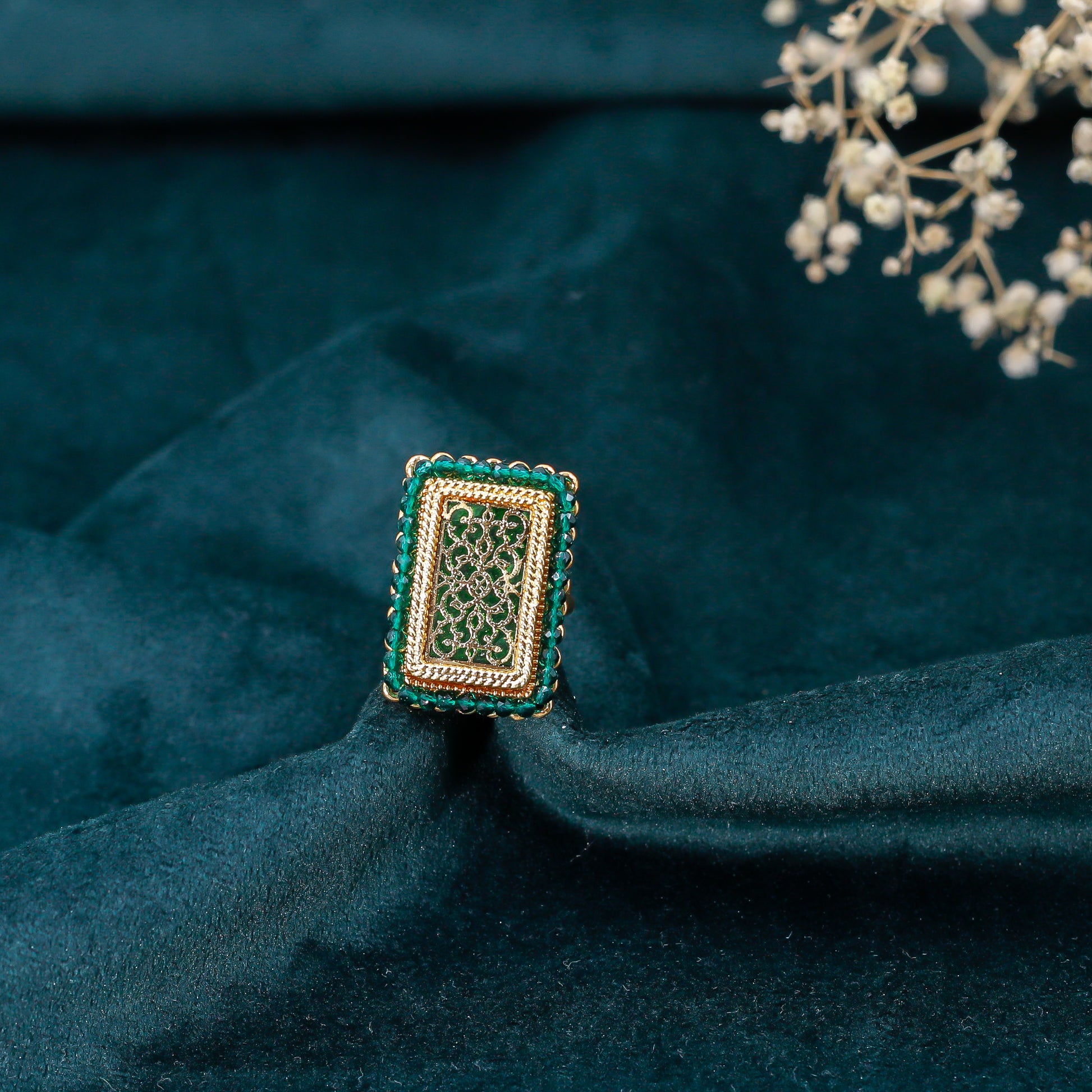 Adorn your fingers with this captivating Thewa design ring, featuring intricate gold filgiri and a rich green enamel border. A perfect blend of heritage and charm, this ring exudes regal grace for any occasion.