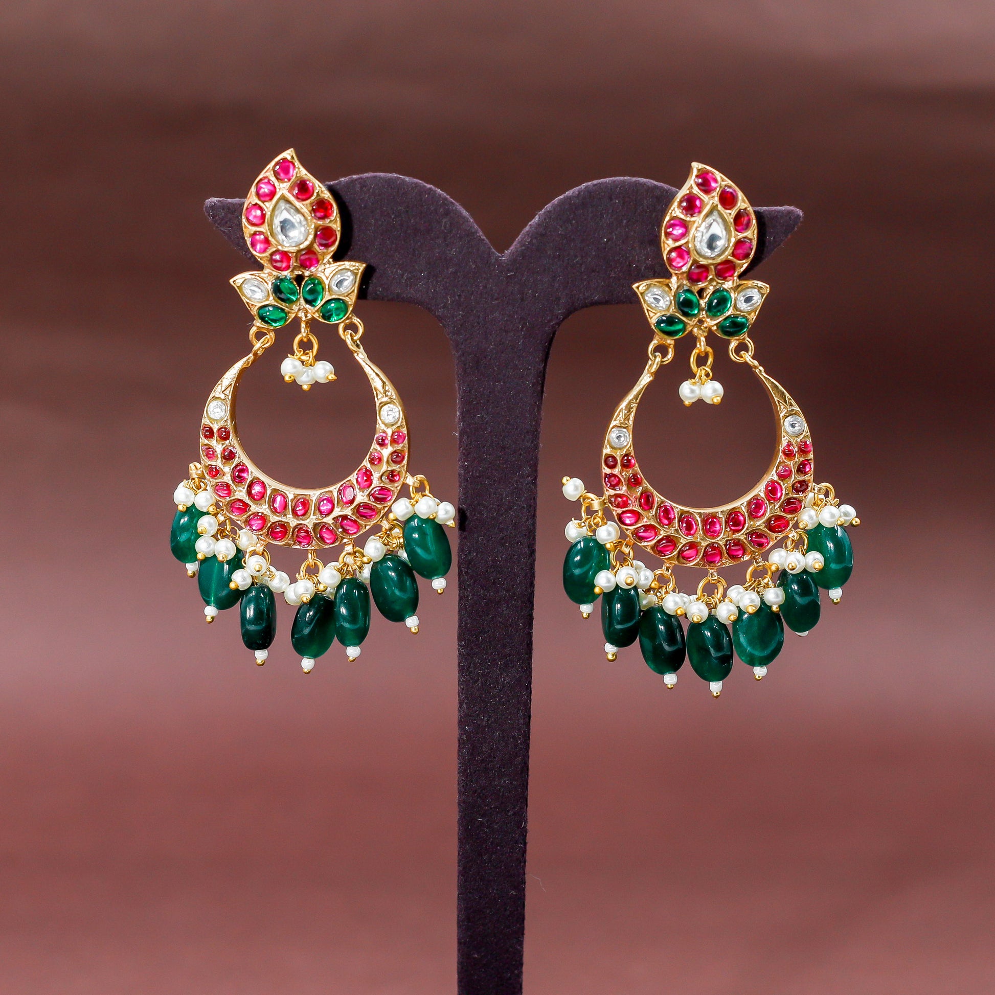 Vibrant Ruby and Emerald Kundan Chaand Balis